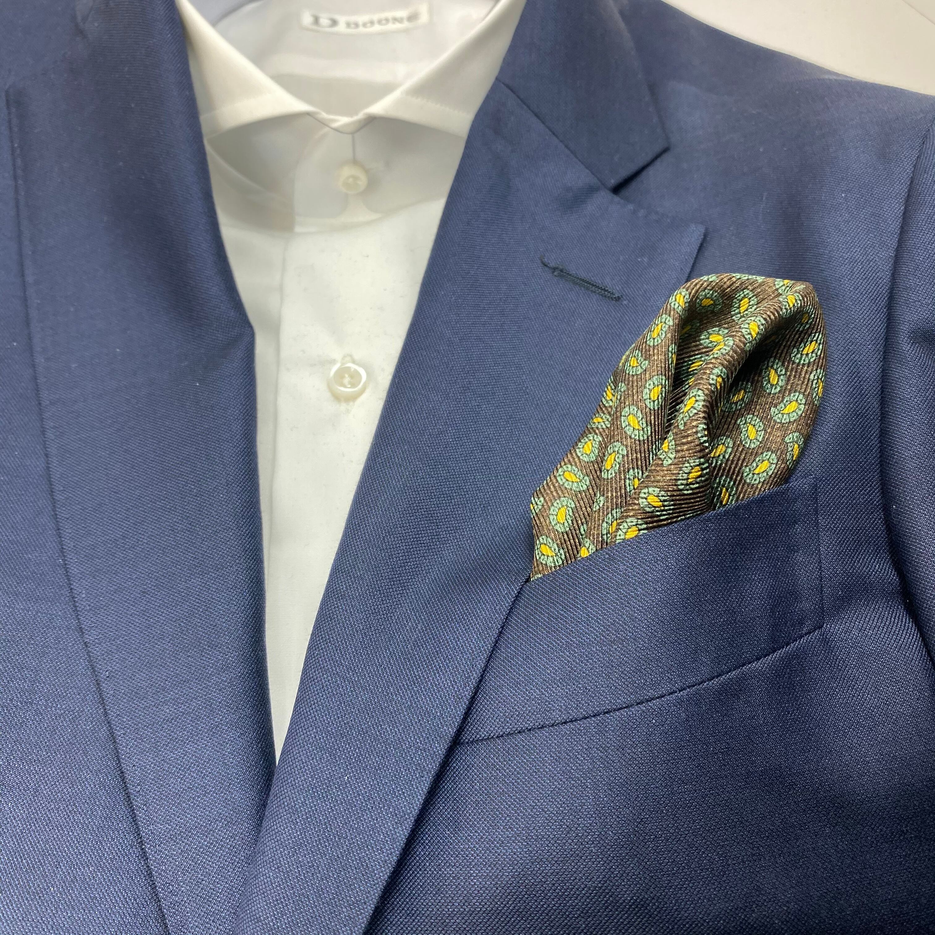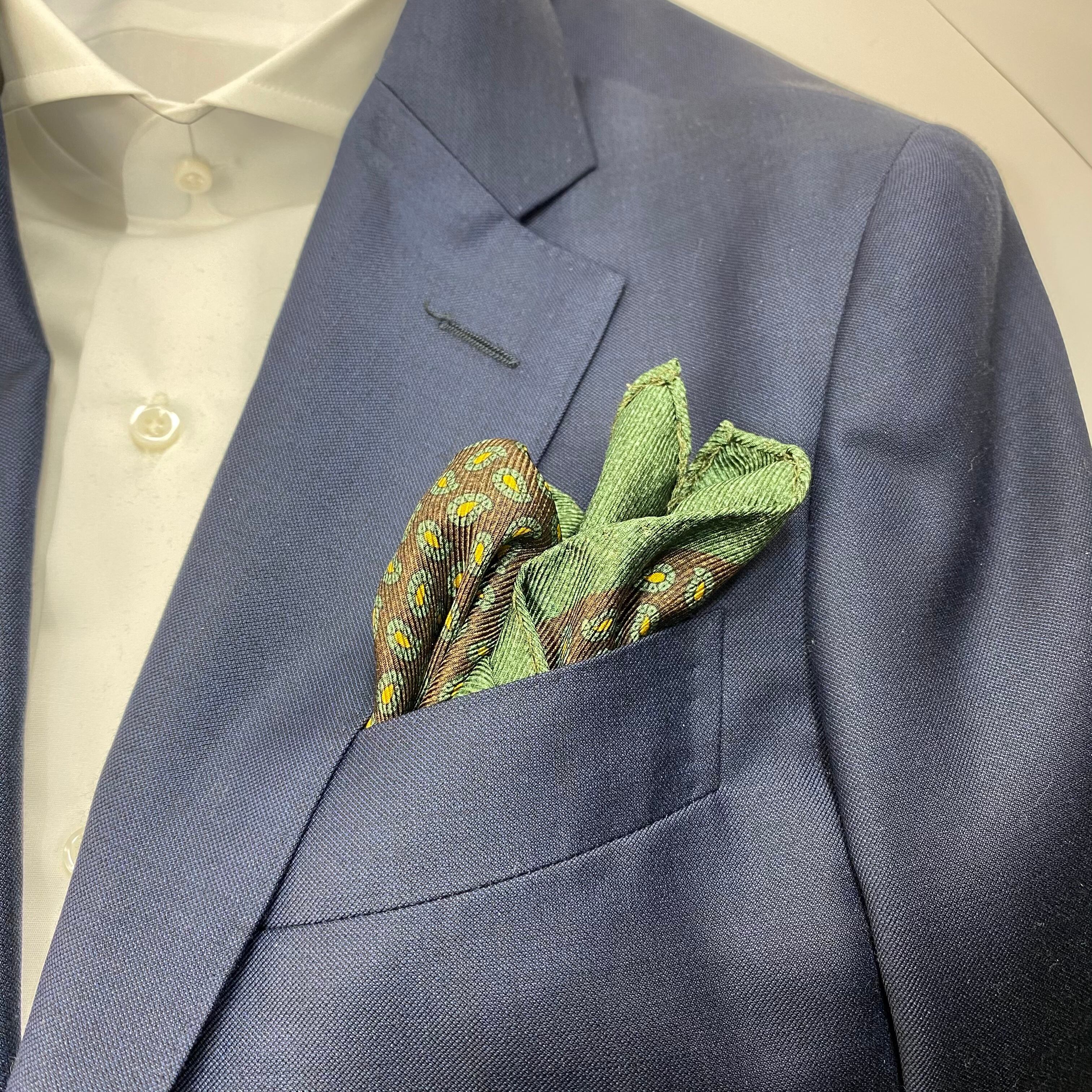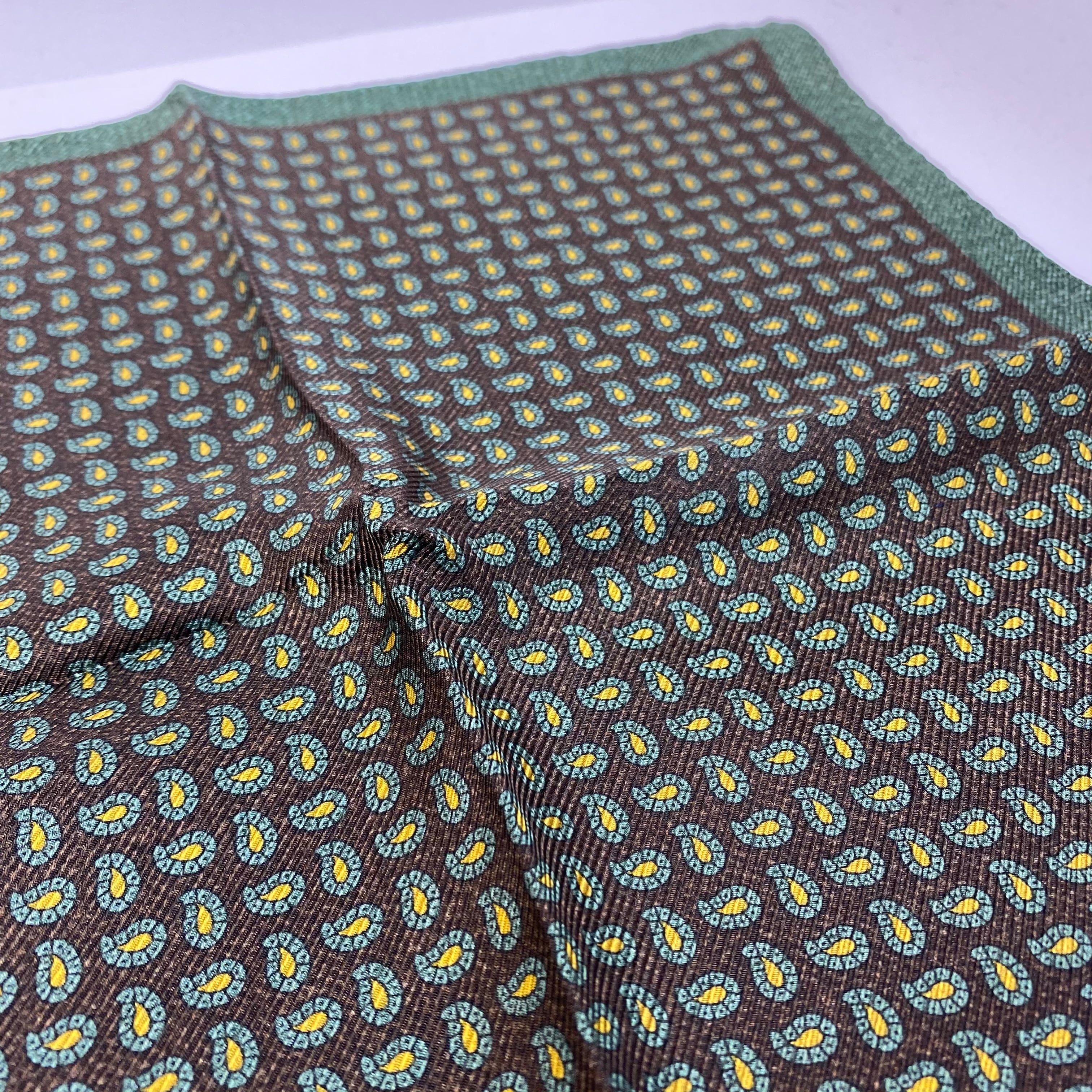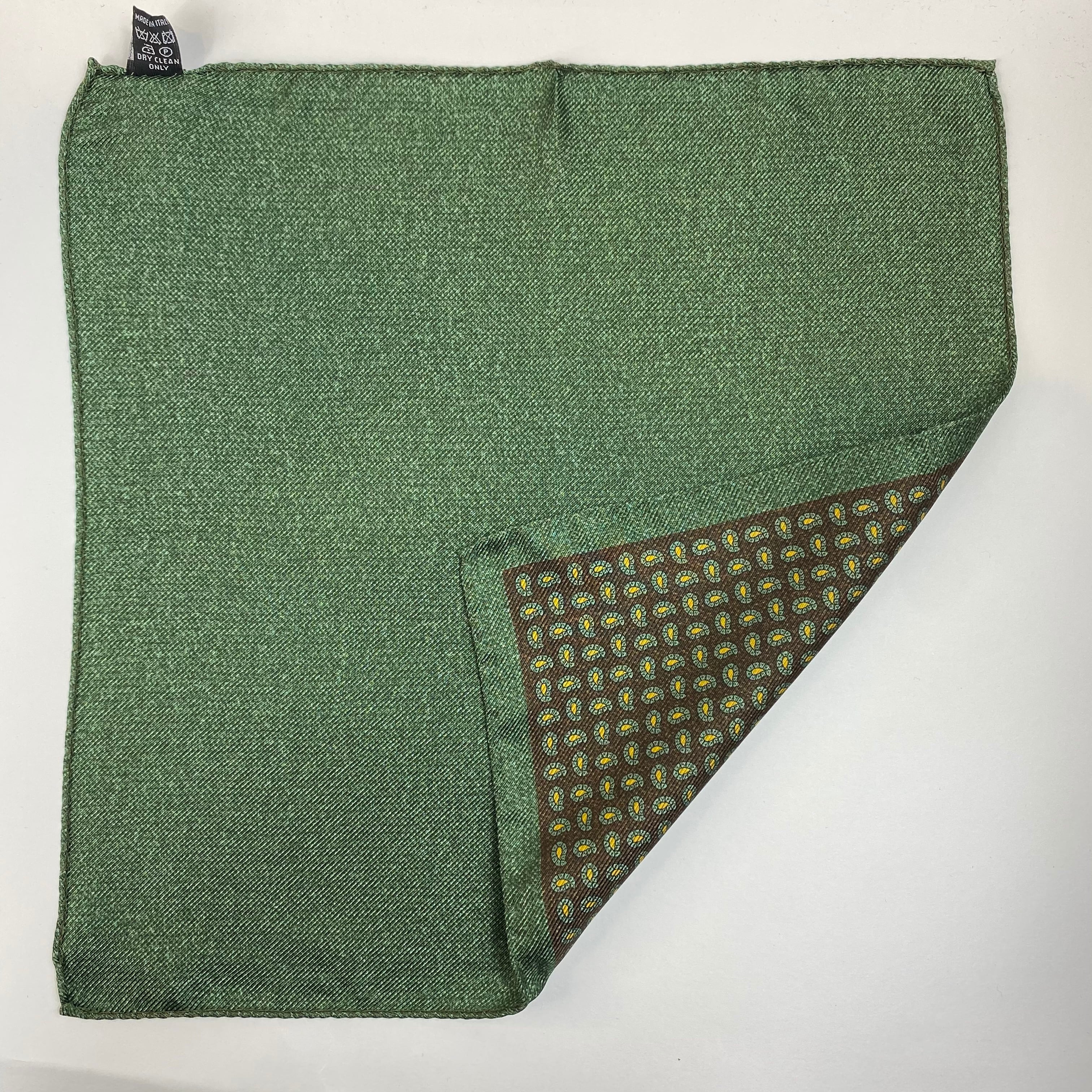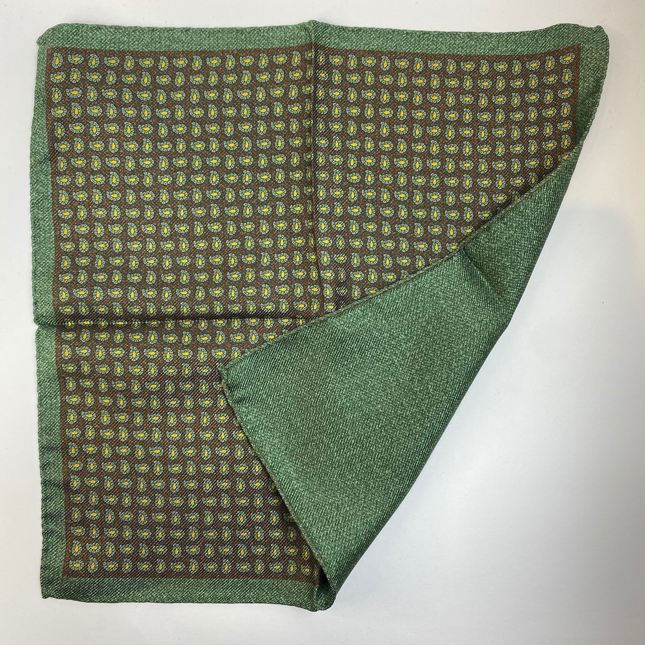 イタリア産 ブラウン×グリーンペイズリー&グリーン無地 リバーシブル シルクチーフ ポケットチーフ お洒落 プレゼント ギフト Vゾーン