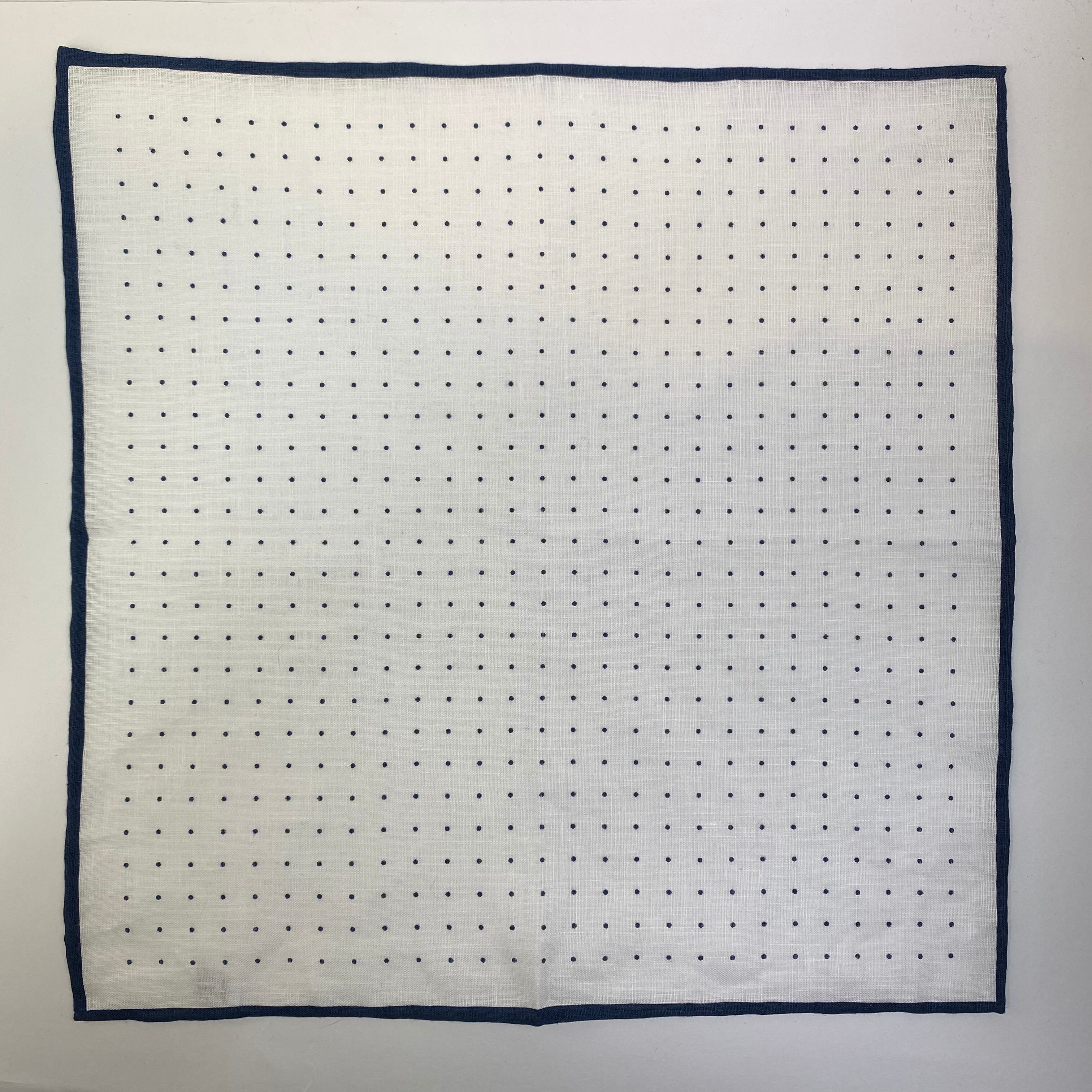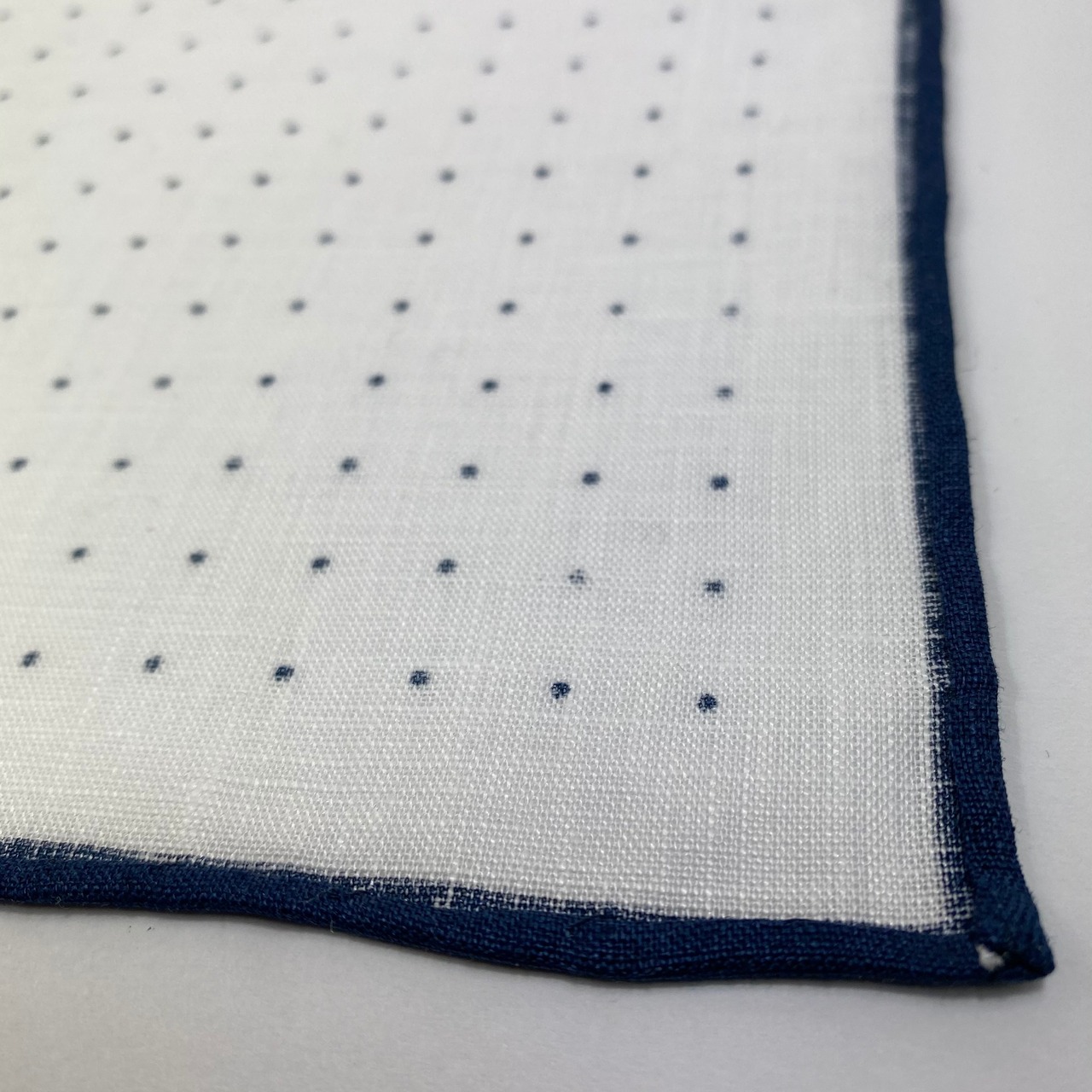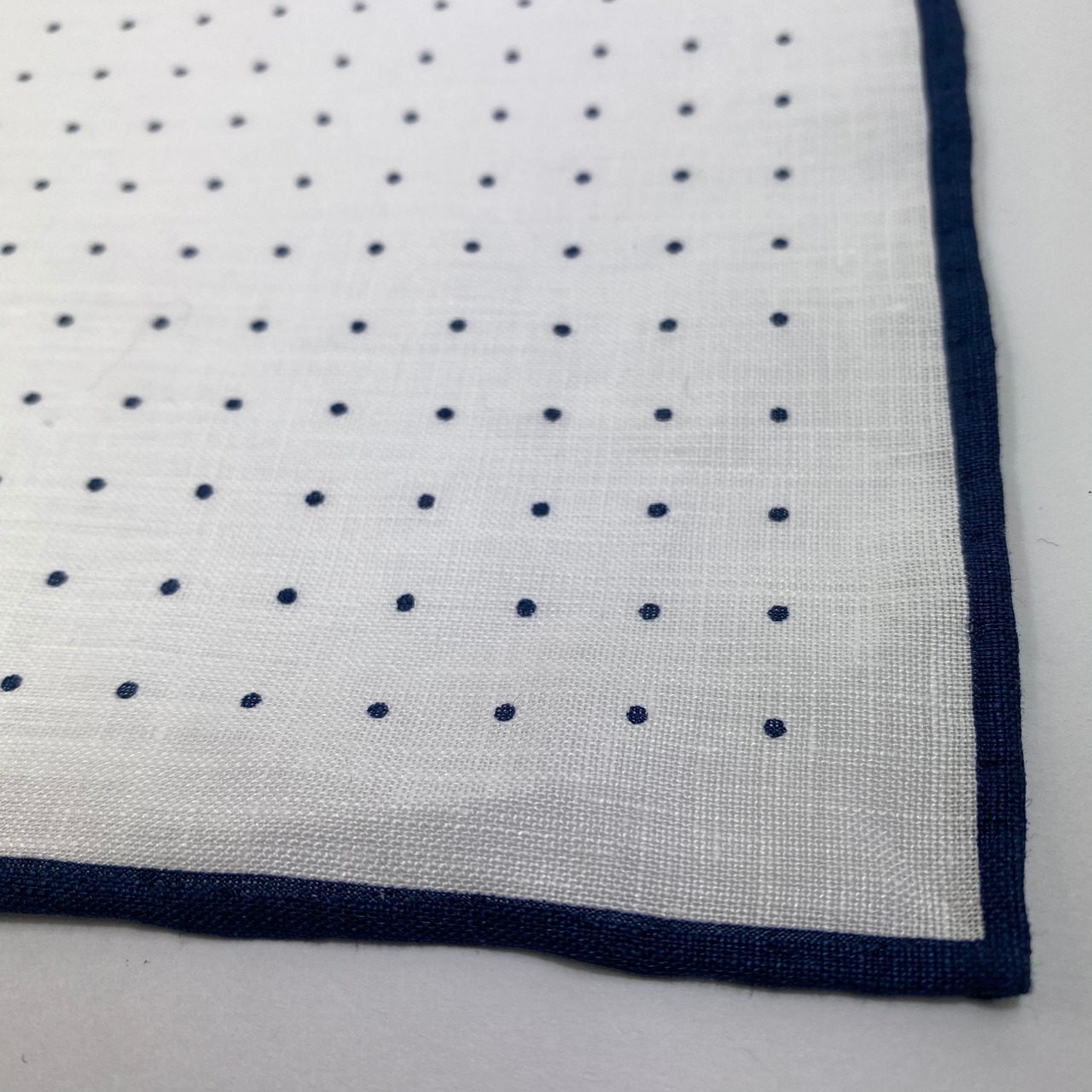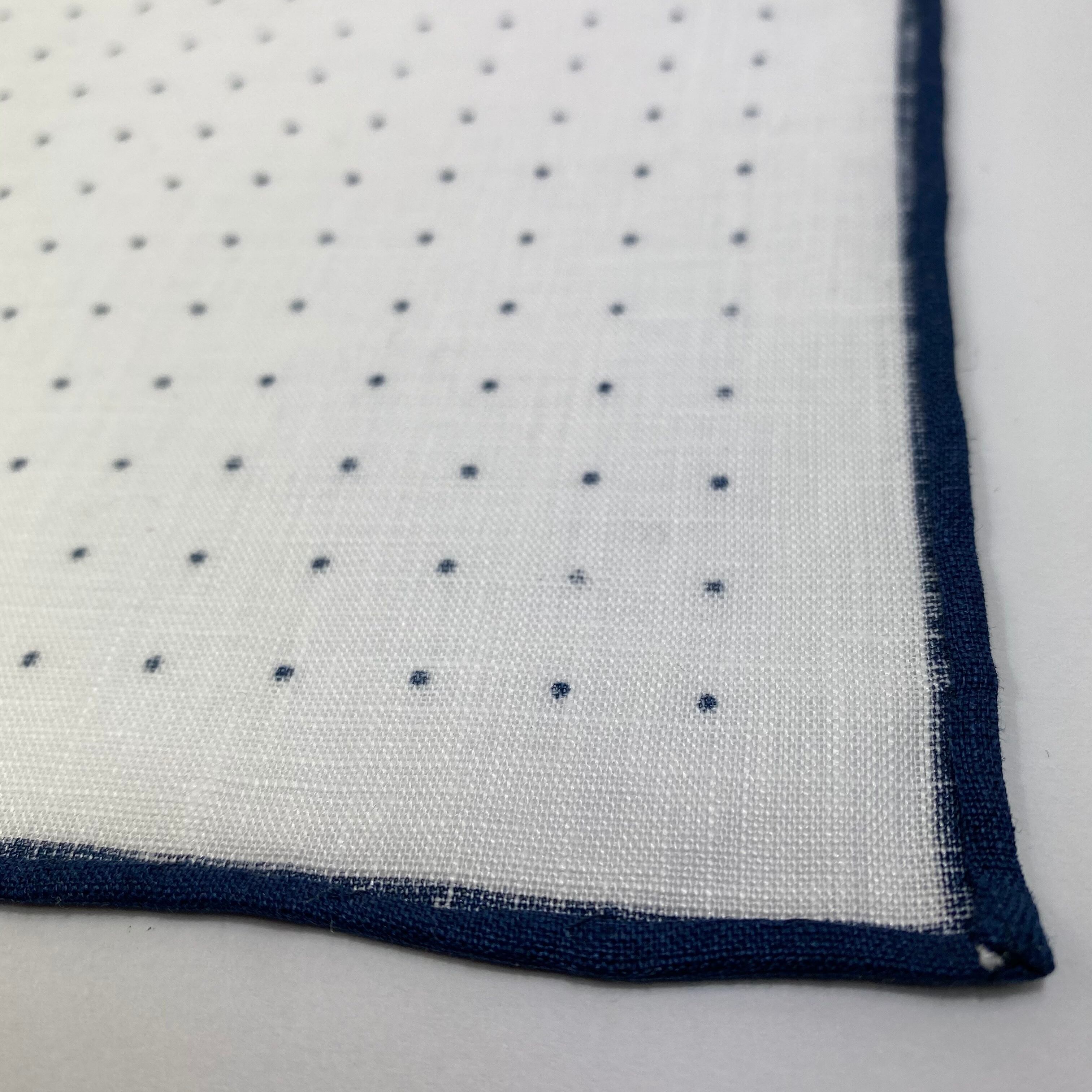 定番リネンのドットポケットチーフ。白ベースにネイビーのドット柄で、ヘム(縁取り)部分はネイビーのパイピングになります。