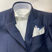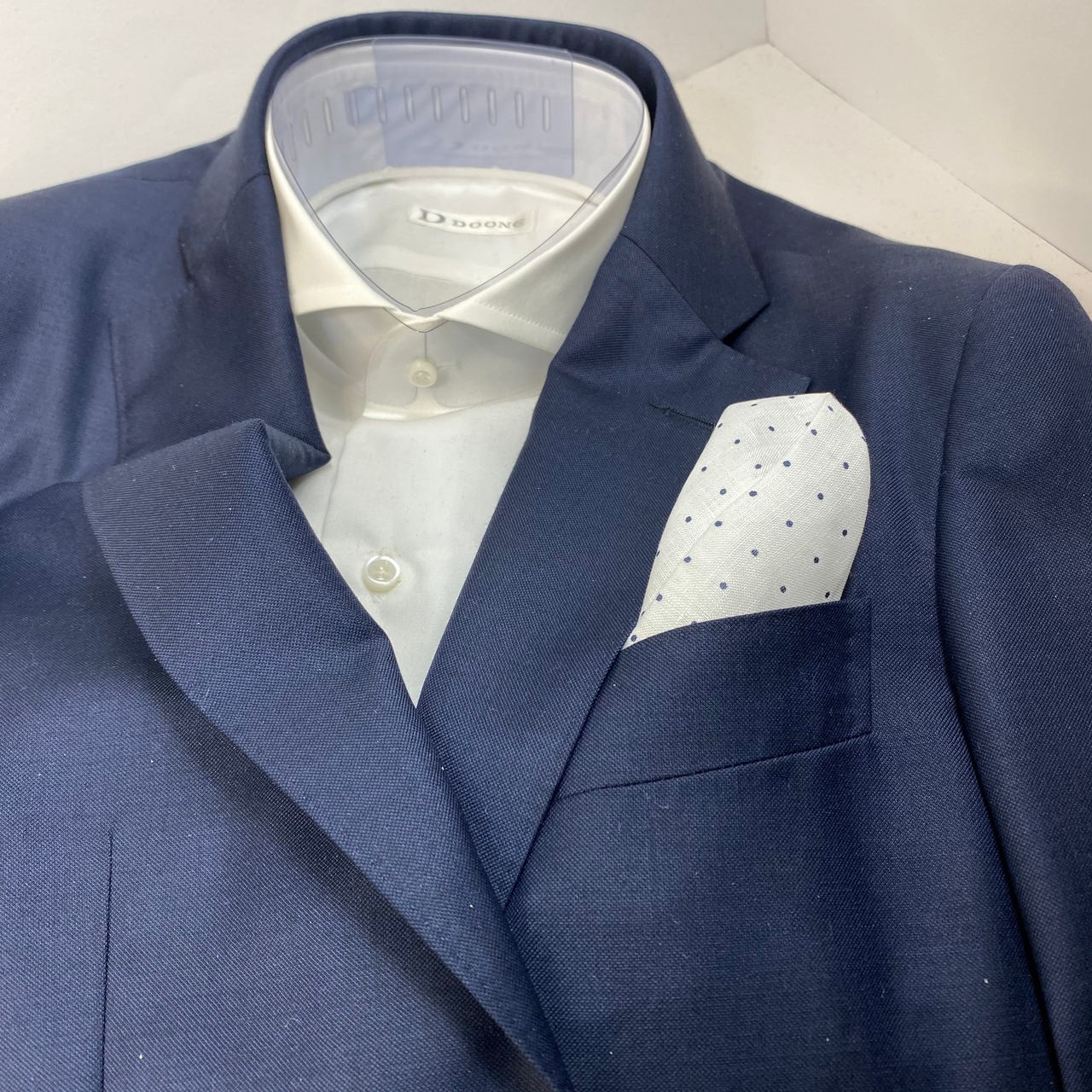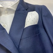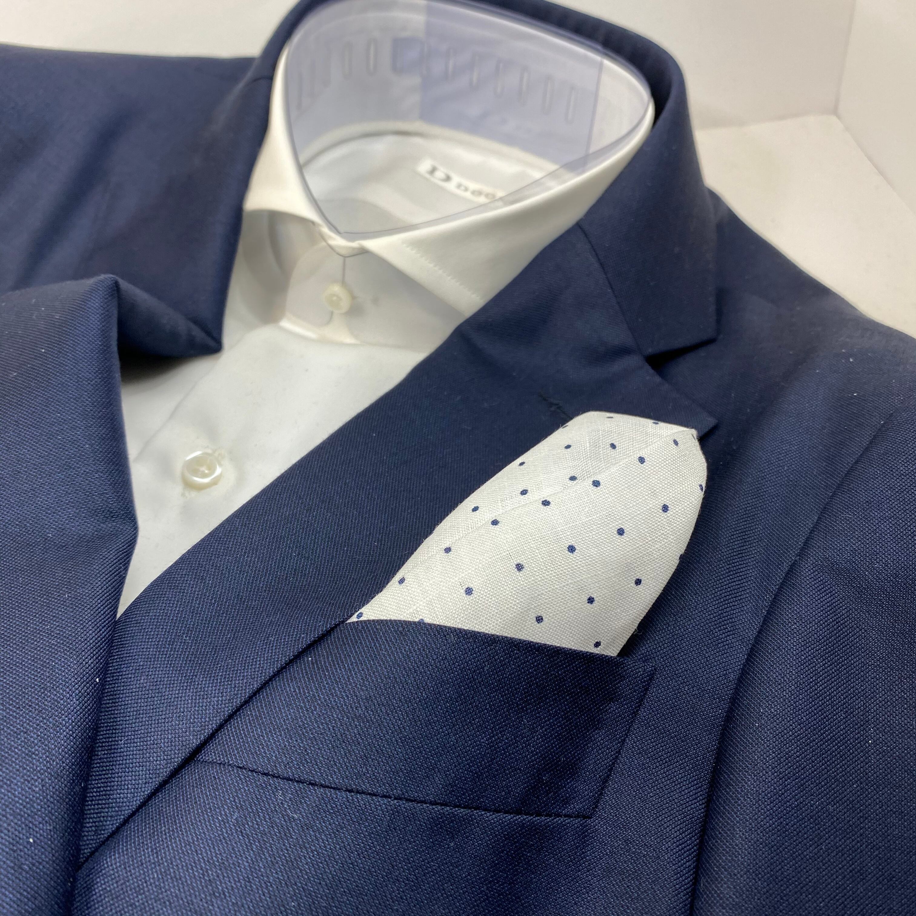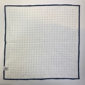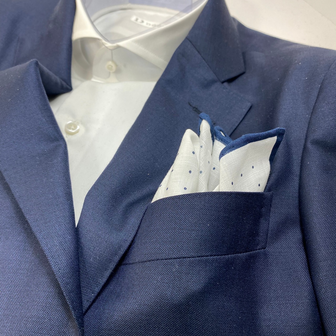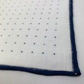 定番リネンのドットポケットチーフ。白ベースにネイビーのドット柄で、ヘム(縁取り)部分はネイビーのパイピングになります。